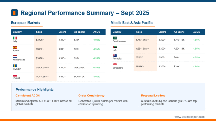 September 2025 demonstrated the strength of our multi-region strategy โ balancing efficiency, scaling across new territories, and maintaining profitability through disciplined ad spending. With consistent ACOS, high order volume, and expanding sales, our teams are well-positioned to build on this success in Q4 2025 and beyond.