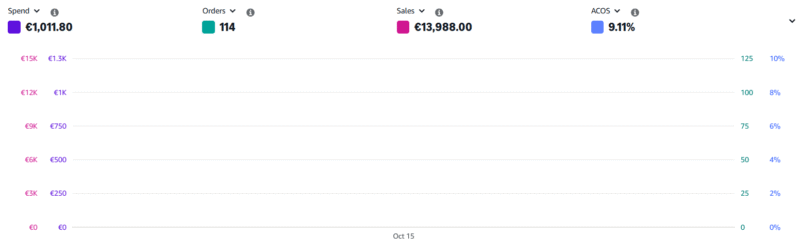 This strong one-day performance underlines the effectiveness of data-driven Amazon PPC management. With just โฌ1,011 in ad spend, the campaigns generated nearly โฌ14K in revenue, proving that when strategy meets execution โ profitability follows.