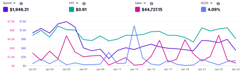 Jan 5: Spend $90 โ†’ Sales $4.5K โ†’ ACoS ~2% (crushing it)